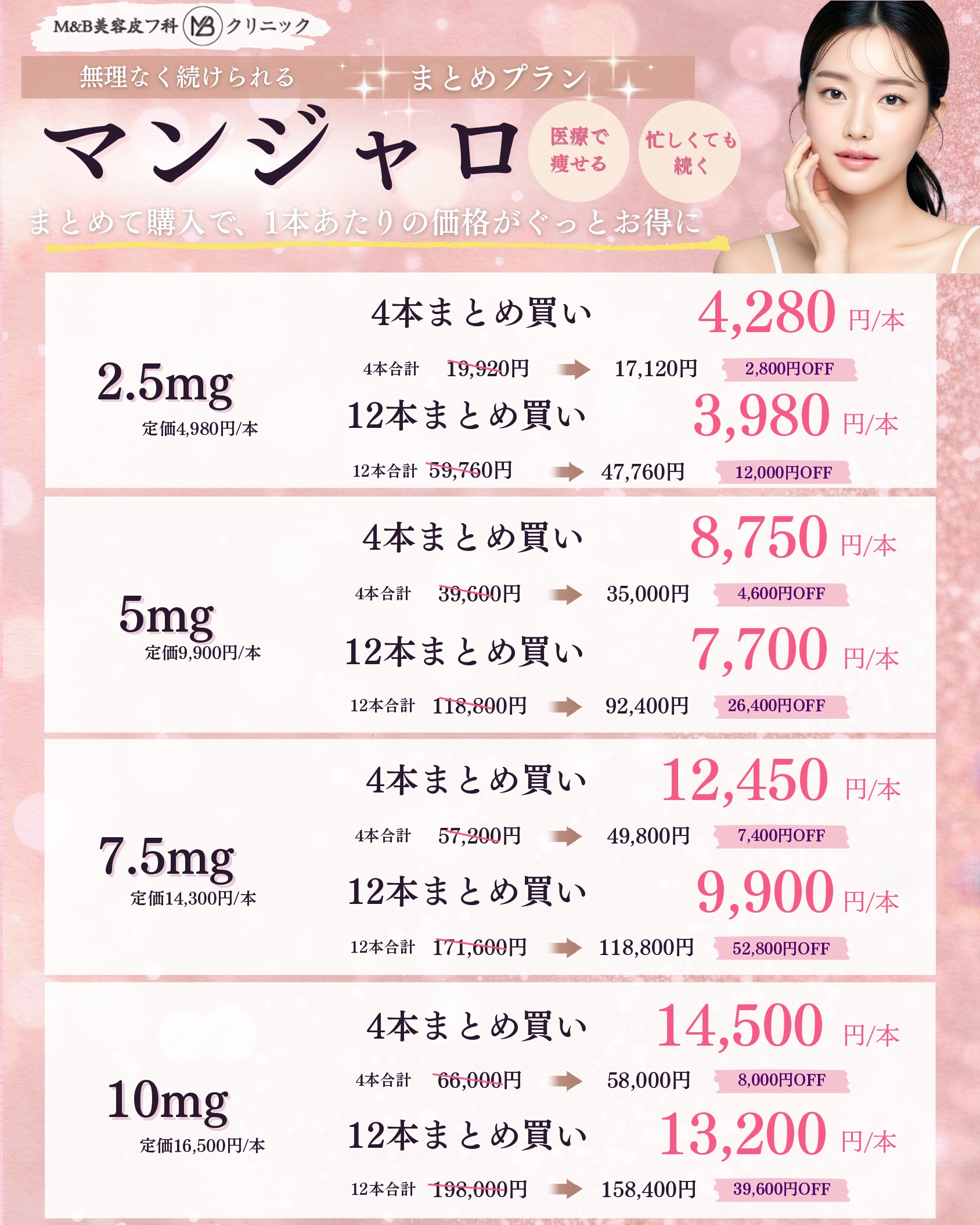 当院では、少しでも多くのかたに美容治療を受けていただきたいという想いから、比較的低価格で治療をご提供しております。また、全てのメニューに「●回コース」のような設定はございません。必要な治療を必要な分だけ低価格でご提供することが当院の方針ですので、「無理にコース契約させられる」などの心配はございません。安心してご来院ください。