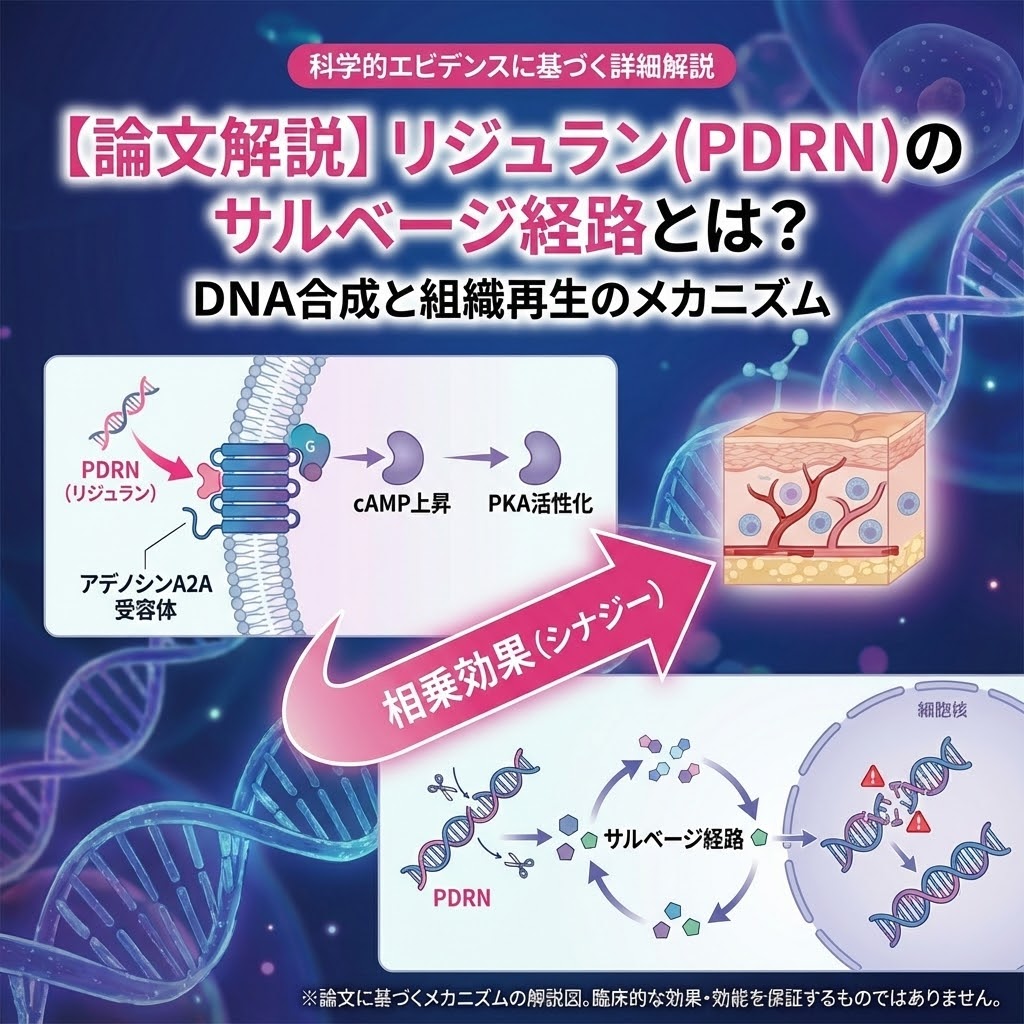 リジュラン(PDRN)の再生医療における作用機序を科学的に解説。DNA合成のサルベージ経路とアデノシンA2A受容体…