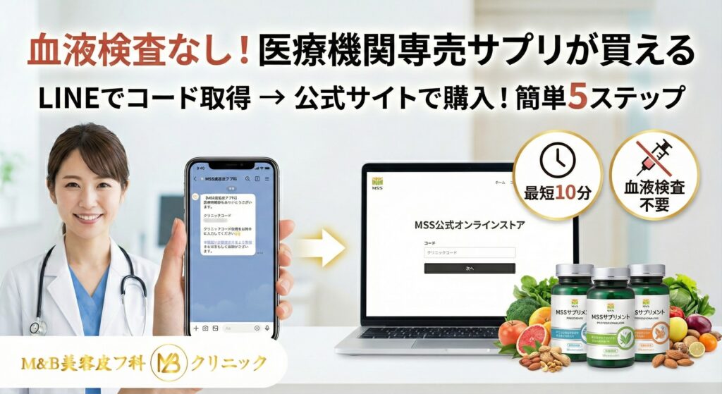 M&B美容皮フ科クリニックでは、血液検査や来院なしで、オンラインで医療機関専売サプリメントをご購入いただけるシステムをご用意しています。LINEで専用コードを取得し、公式サイトで登録するだけで、ご自宅にいながら医療機関で取り扱うMSSオーダーメイドサプリメントを入手できます。