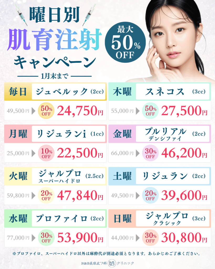 曜日別肌育注射キャンペーン(2026年1月末まで)最大50%OFF。ジュベルック、リジュランi、ジャルプロ、プロファイロ、スネコス、プルリアル、リジュランを特別価格で。