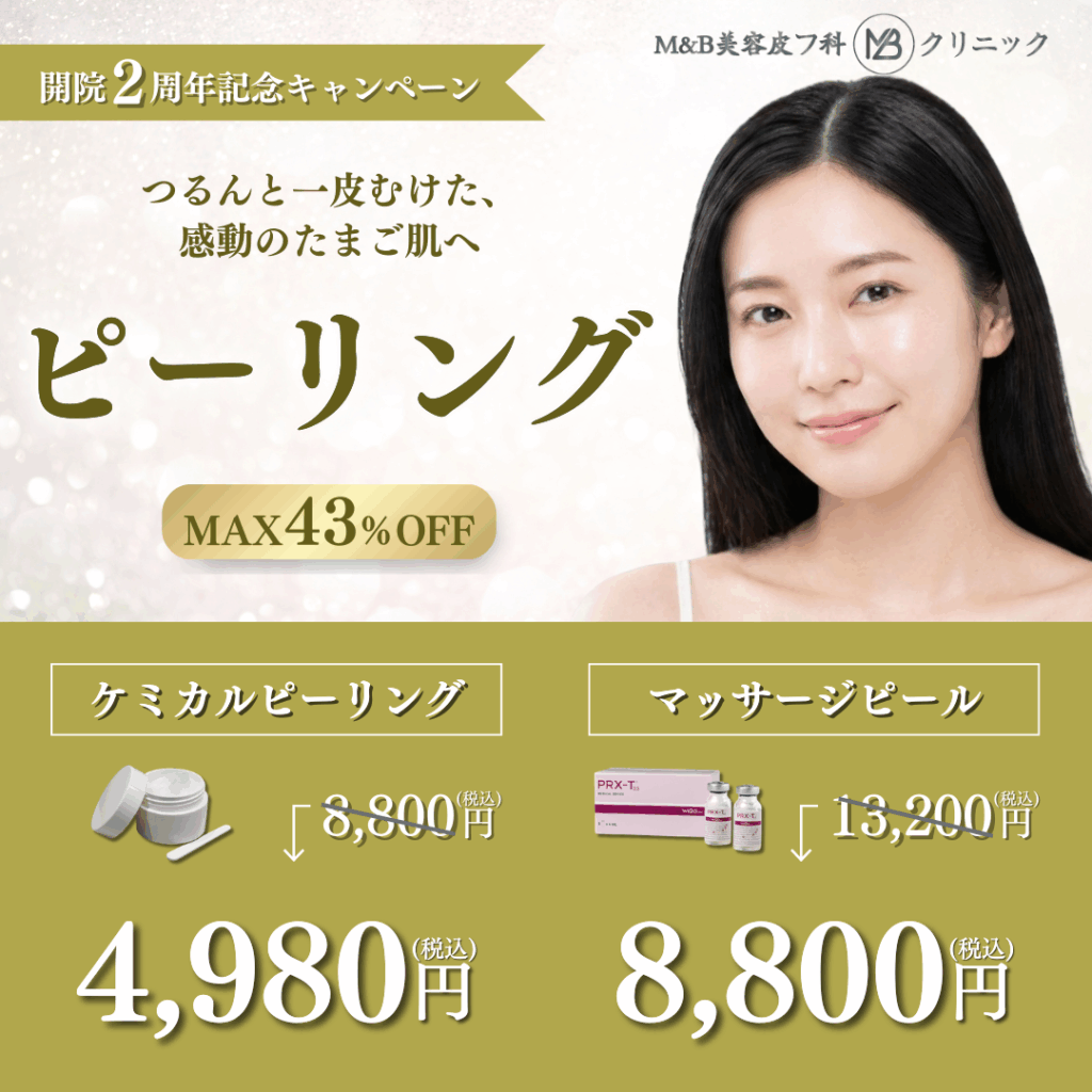 【開院2周年記念キャンペーン】大阪でピーリングならM&B美容皮フ科クリニック。2026年4月30日までの期間限定です。