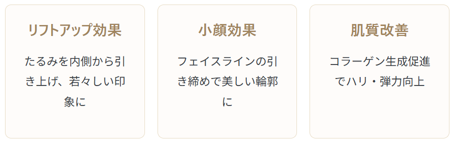 また顔全体のリフトアップ効果だけでなく、糸に生えたトゲが細胞を刺激しコラーゲンやエラスチンの生成を促進するため、糸が完全に溶けるまでの間は肌のハリや弾力をアップさせるという美肌効果も期待できます。