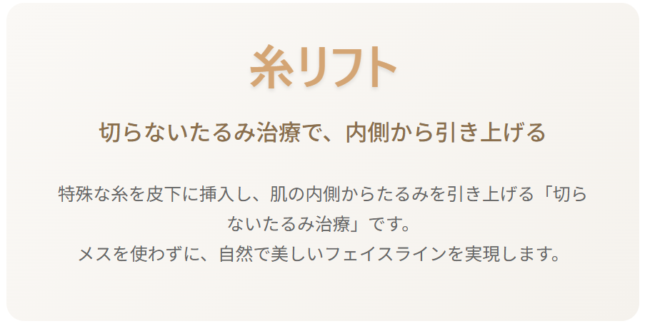 糸リフトとは、加齢とともにたるんだ皮膚の下に特殊な糸を挿し込み、肌の内側から引き上げて改善する「切らないたるみ治療」です。